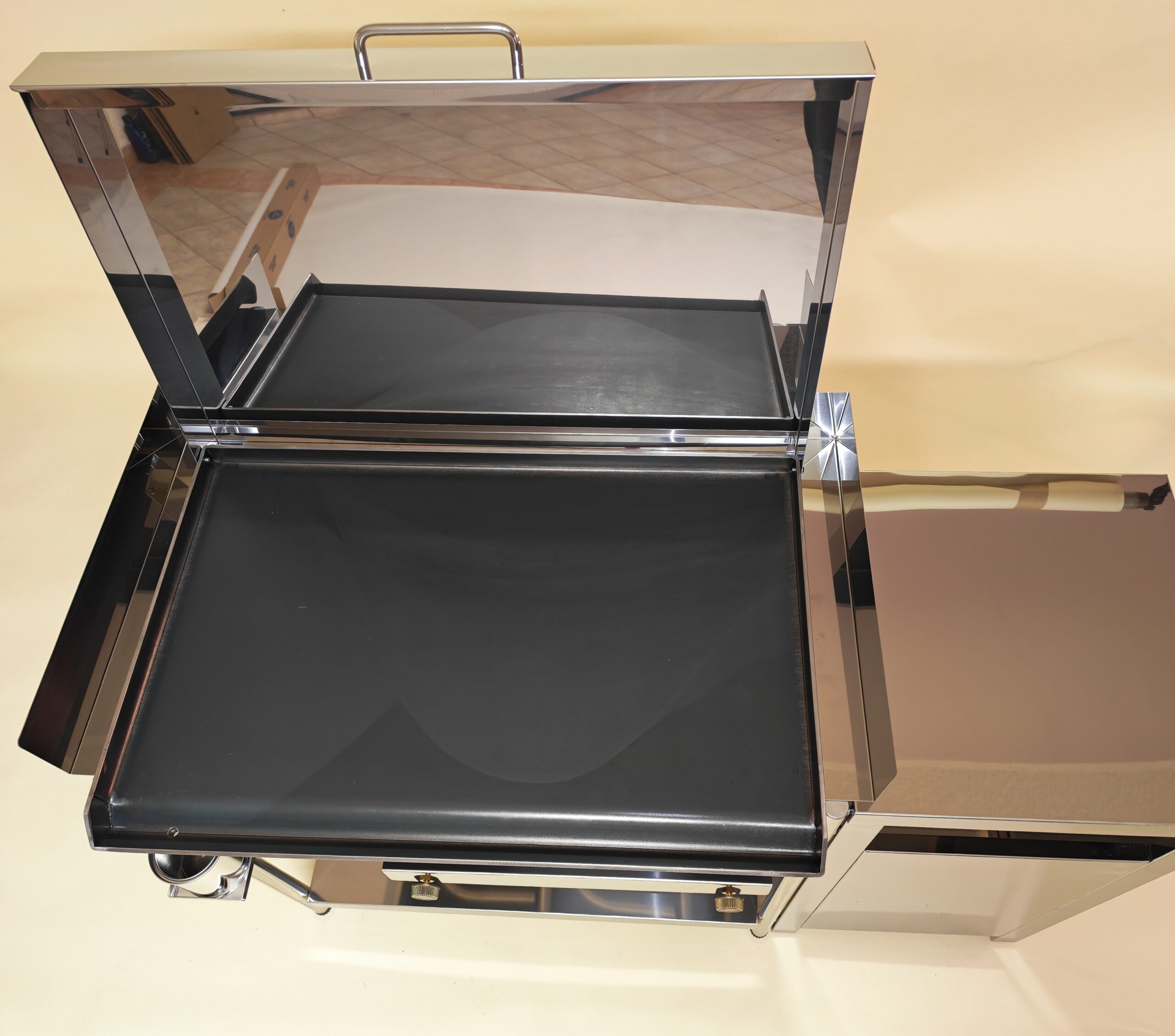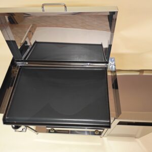 Kuhalna plošča dimenzije 70 × 45 cm in debeline 5 mm omogoča odlično akumulacijo toplote ter enakomerno segrevanje celotne površine. To zagotavlja stabilno in ponovljivo peko tudi pri pripravi večjih količin hrane.
