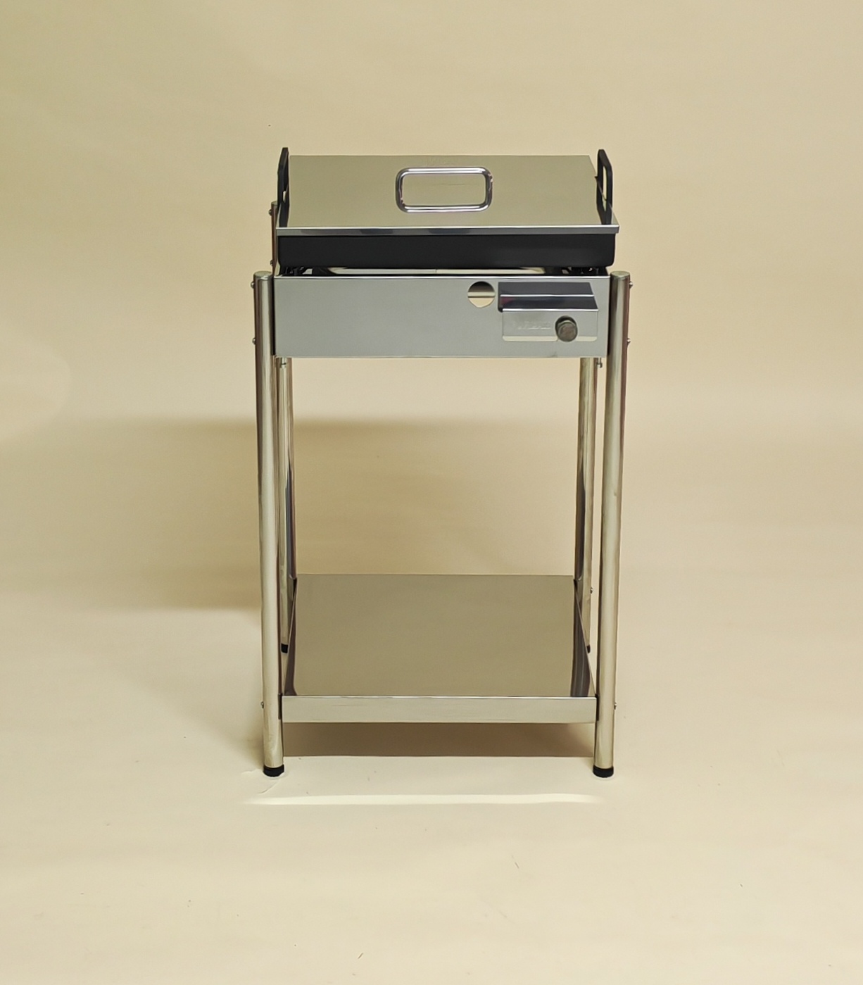 Postavljen je na stabilne inox noge in ima vključeno spodnjo polico, ki nudi praktičen dodaten odlagalni prostor za pribor ali posodo.