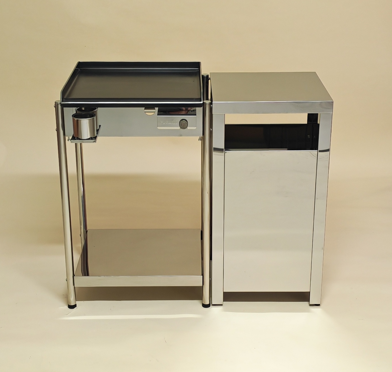 Model P450 PRO ima stabilne noge, spodnjo polico za dodatno opremo ter inox box, ki elegantno zakrije plinsko jeklenko in dopolni celotno postavitev.